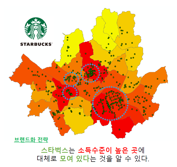 더 나아가, 스타벅스는 브랜드를 강조한 마켓팅을 진행해 왔기 때문에 서울시에 있는 모든 고객을 타겟할 이유가 없었다고 생각한다. 오히려, 스타벅스에 로열한 고객 타겟층을 사로잡기 위해서 직장인을 포함한 유동인구가 가장 많은 지역에 집중하여 점포을 늘려가는 것이 스타벅스를 애용하는 고객들이 자리가 부족해 다른 커피숍으로 넘어가는 것을 방지했을거라 생각한다.