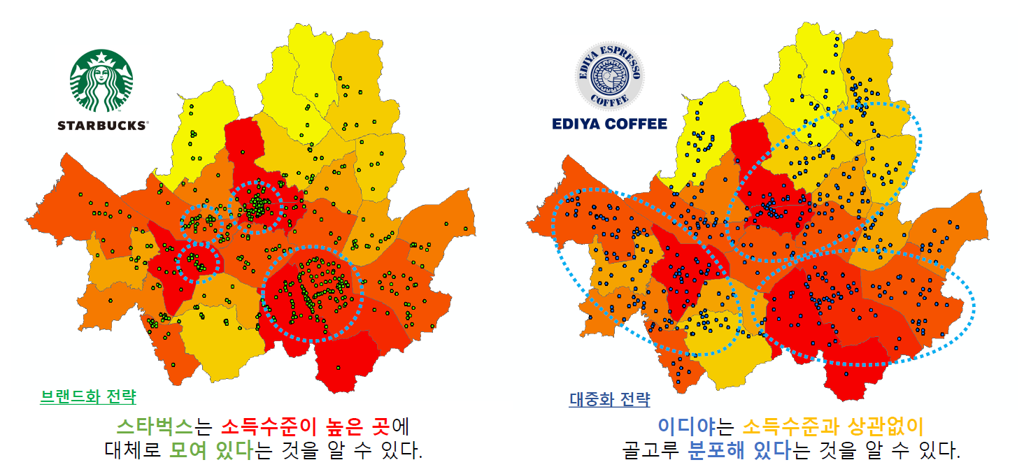 이와 반대로, 이디야는 소득 수준과 상관없이 균일하게 분포하고 있는 양상을 보였다. 소득 수준이 높은 지역에 조금 더 많이 분포하는 모습은 있었지만, 노원구, 성북구, 강북구, 도봉구 등의 소득이 낮은 지역에도 골고루 분포되어 있는 모습을 볼 수 있었다. 앞서 스타벅스의 전략을 설명하는 과정에서 스타벅스가 한 모체를 가진 팀이었다면, 이디야는 개인 플레이에 특화되어 각 동네를 지키는 동네지킴이 역할을 수행했다고 본다.