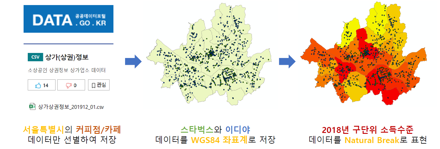 그래서 두 커피 전문점이 과연 어떤 전략으로 한국 시장에서 버티고 있는지를 지리적으로 비교해보고 싶은 마음에 이를 직접 ArcGIS로 분석하는 시도를 해보았다. 단순한 호기심이었기에 어려운 분석없이 가벼운 시각화를 진행하였다.
