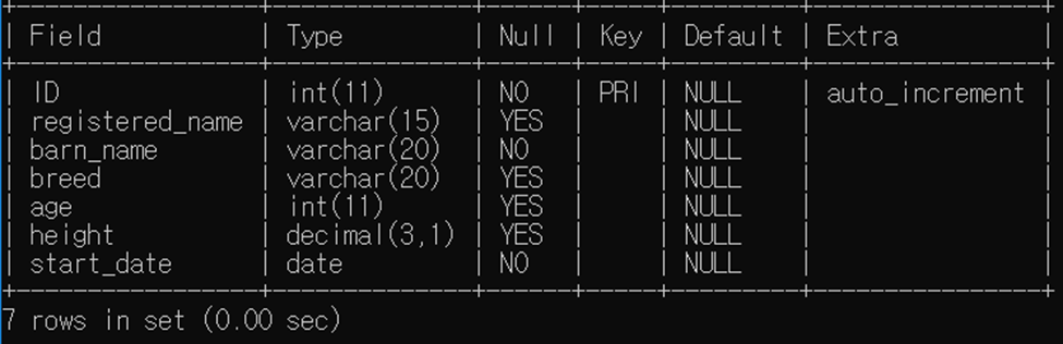 앞서 'horse' 테이블에서 정의했던 속성들이 모두 제대로 들어간 것을 확인할 수 있다.