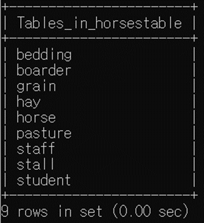 우리가 생성할 테이블은 총 9개로 (말, 기수, 학생, 곡물, 건초, 침구, 직원, 호실, 목초지)이다.