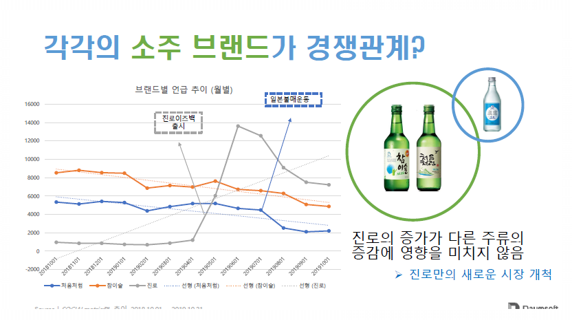 마찬가지로 진로와 다른 소주들과의 경쟁 구도를 알아보기 위해 언급 추이 비교를 진행했다. 그 결과, 진로의 언급량 증가에도 다른 소주들의 증감에 큰 영향이 없었다. 언급량이 소비로 이어진다는 것을 가정했을 때, 이는 진로가 기존의 소주 시장을 벗어나 새로운 시장을 개척했을 수도 있다는 것을 보여주는 지표였다.