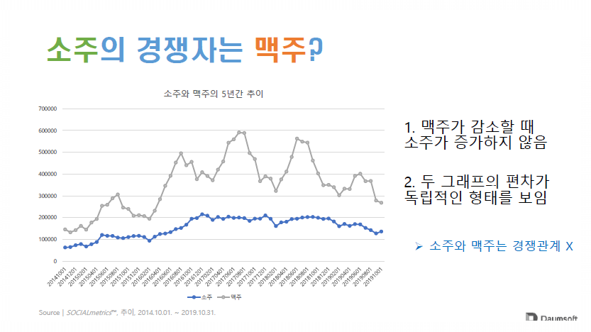 그 다음으로는 주류의 경쟁 구도에 대해서 알아보기 위해, 맥주와 소주의 언급량을 조회했다. 조회 결과, 맥주는 증감 폭이 클뿐만 아니라 소주의 언급량과 다른 양상을 보인다는 것을 알 수 있었다. 물론 해당 지표가 소주와 맥주가 서로 영향을 주지 않는다고는 할 수 없었지만, 적어도 서로 다른 외부 요인의 영향을 받는다는 것을 해당 지표를 통해 알 수 있었다.