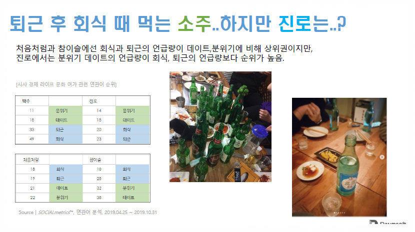 바로 기존의 소주와 함께 나타나는 키워드들과 달리, 진로는 맥주와 비슷한 키워드를 포함하는 경우가 많았다는 점이다. 특히 분위기와 데이트라는 키워드에서 기존의 소주들이 회식과 퇴근이 더욱 높은 언급량을 보인 것과는 반대로, 분위기와 데이트가 더 높은 순위를 차지한 맥주와 비슷한 양상을 보였다.