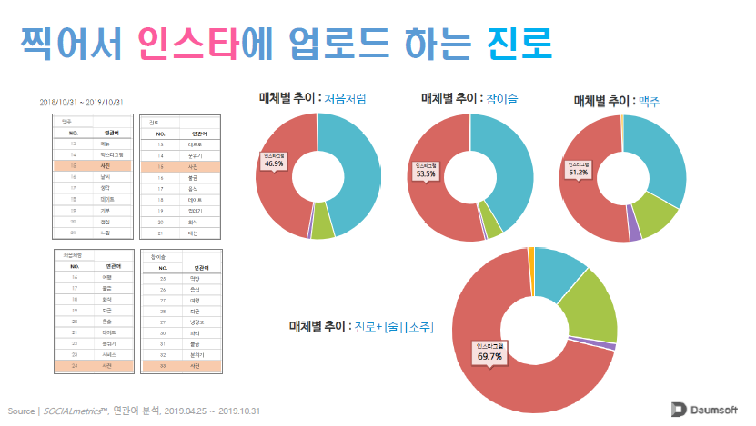 소셜메트릭스를 사용하면 '진로'라는 소주가 얼마나 언급되는지 쉽게 파악할 수 있을거라 생각했고, 어떤 차별점을 가졌기에 기존 주력 제품들 사이에서 살아남을 수 있었는지를 관련 키워드들로 알 수 있을거라 생각했다.