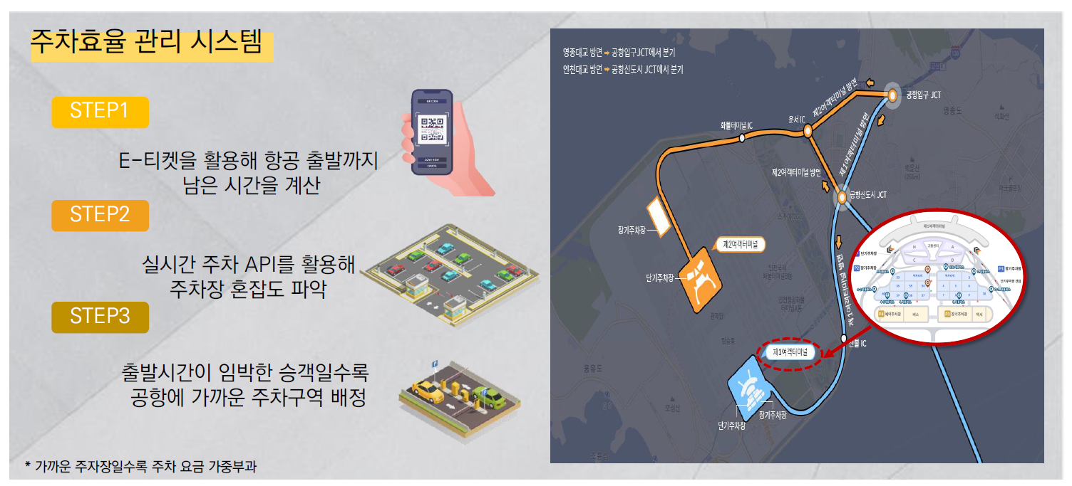 그리고 추가적인 제언으로, 주차효율 관리 시스템이라는 방안을 구상해보았다. 출발 시간이 임박한 승객을 배려해 공항에 가까운 주차구역에 배정해주는 대신, 요금을 가중부과하여 받는 방안이었다. 즉, 정당한 금액을 지불받는 동시에 항공 지연을 조금이라도 막을 수 있는 방안이라 생각하였다.