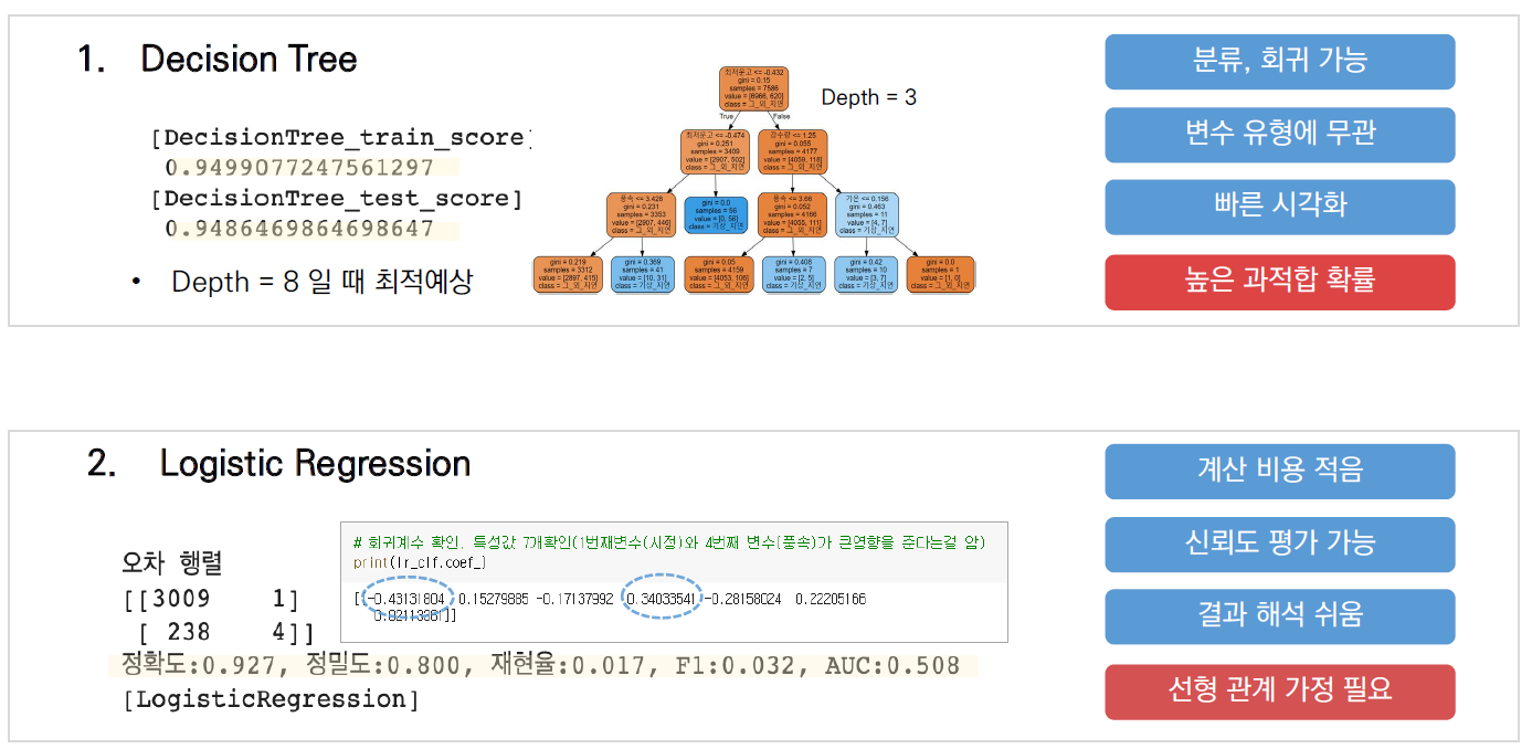 이후, 의사결정 나무와 로지스틱 회귀를 통해 기상 요인에 따라 지연을 예측하는 시도를 해보았다. 의사결정 나무는 깊이가 8일때 지연을 제대로 예측하였지만, 과적합이 예상되었다. 로지스틱 회귀는 시정과 풍속이 지연에 가장 큰 영향을 미치다는 것을 알려주었지만 선형 관계를 가진다는 가정이 필요했다.
