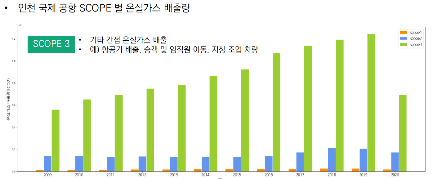 우선, 분석에 앞서 공항 온실가스가 어디서 발생하는지 알아보았다. 그 과정에서 공항 온실가스가 직접, 간접, 기타 요인에 따라 SCOPE별로 나눠져 있다는 것을 배울 수 있었다.