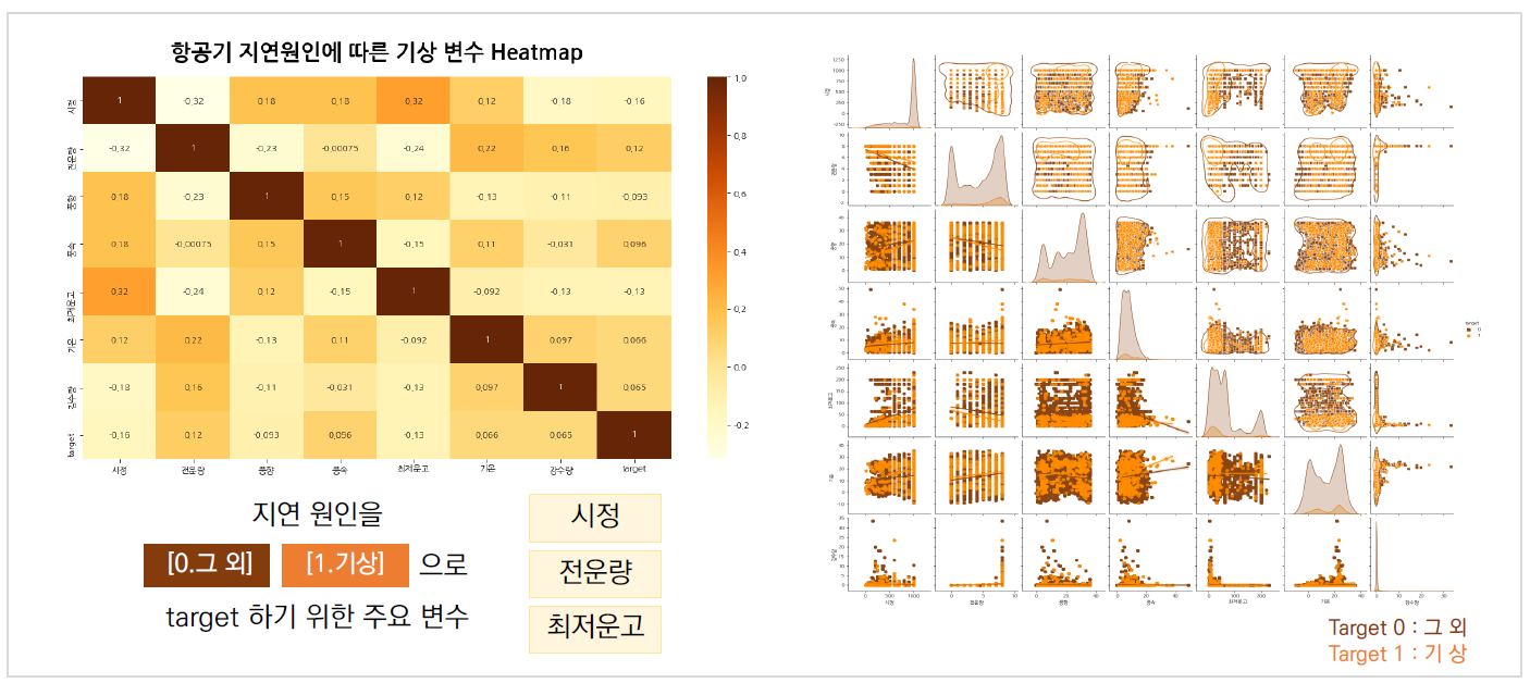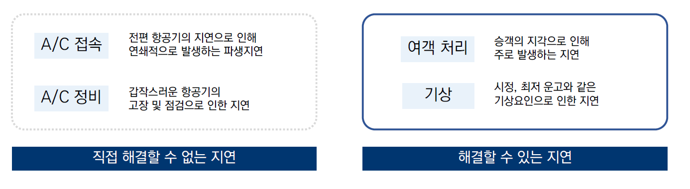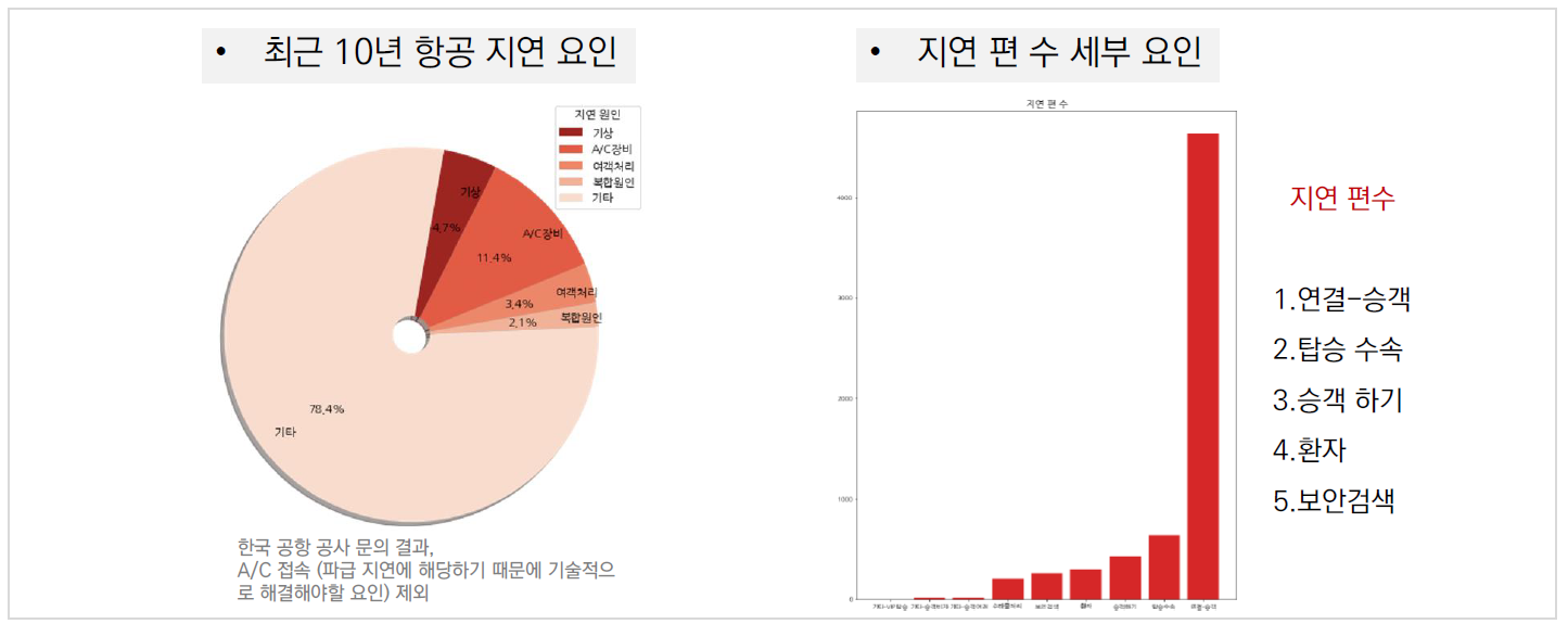 조사 결과, 항공 지연은 여러 가지 요인으로 발생하였고 그 중에서 우리가 해결할 수 있는 지연은 여객 처리와 기상이었다. 그렇기에 두 지연 요인들에 초점을 맞추어 분석을 진행하였다.