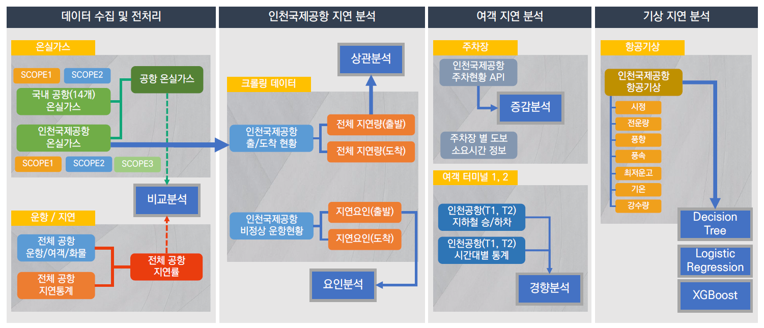 전체적인 과정은 데이터 수집 및 전처리, 인천국제공항 지연 분석, 여객 지연 분석, 기상 지연 분석으로 나눠서 분석을 진행했다. 가장 데이터가 많았던 인천국제공항을 위주로 분석을 진행하였고, 필요한 데이터들은 그린리포트, 항공정보 포탈 시스템, 공공데이터 포털, 서울 열린 데이터 광장, 항공기상청 등 다양한 곳에서 확보하였다.