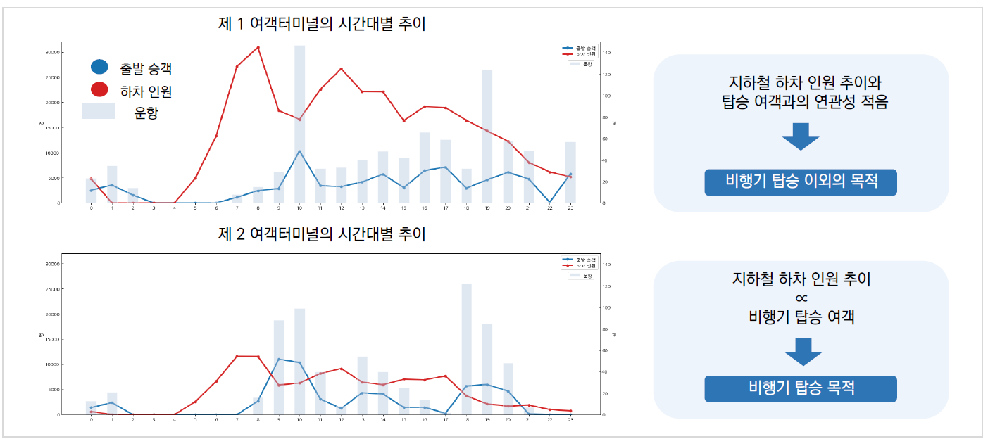 그 다음으로는 지하철 승하차를 확인했다. 운항 수와 하차 인원이 2~3시간 차이로 비슷한 양상을 보였다. 즉, 비행기를 타기 위해 승객들은 주로 2~3시간 일찍 도착해서 기다린다는 것을 알 수 있었다. 주로 여행가기 좋은 오전 시간에 승객들이 몰린다는 것을 알 수 있었다.