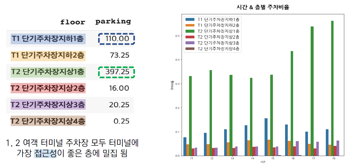 분석 당시 코로나19로 인해 여행객이 줄어들면서 주차공간이 널널했지만, 코로나19 이후에는 그래프에 나타난 순서대로 주차장이 가득찰 것이 예상되었다. 즉 비행기 출발 시간과 관계없이 주차가 되어, 공항에 늦게 도착해 한시가 급한 승객들이 공항과의 거리가 먼 주차장에 차를 주차할 확률이 높다는 것을 알 수 있었다.