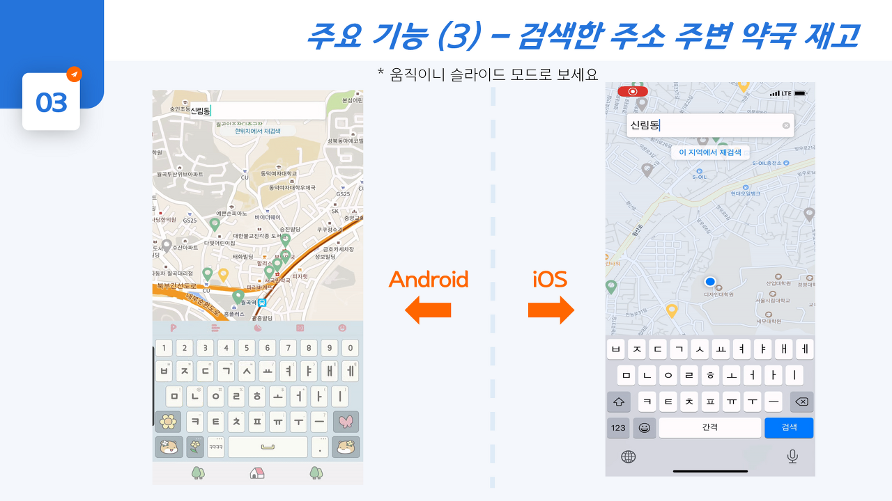개발은 안드로이드와 IOS 팀으로 나누어 빠르게 진행하였다. 안드로이드는 개발언어로 Java를 이용하였고, IOS는 Swift를 이용하였다. 협동툴로는 Slack과 Github를 사용하여 개발을 진행하였다. 프로젝트에서 담당했던 부분은 프론트엔드와 지도 API 활성화 및 기능 적용이었다.