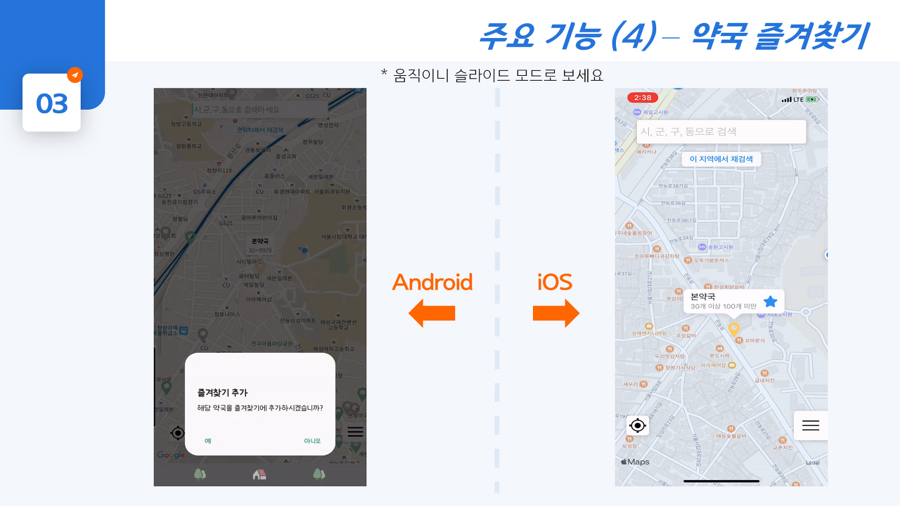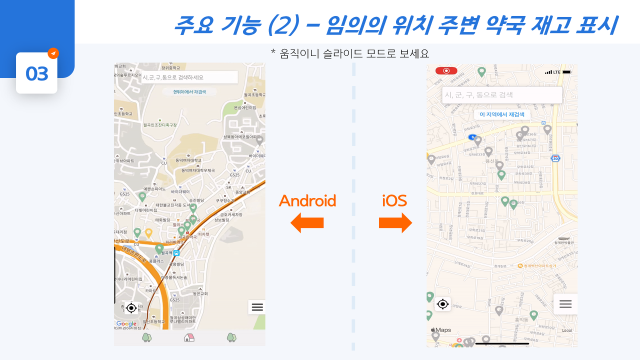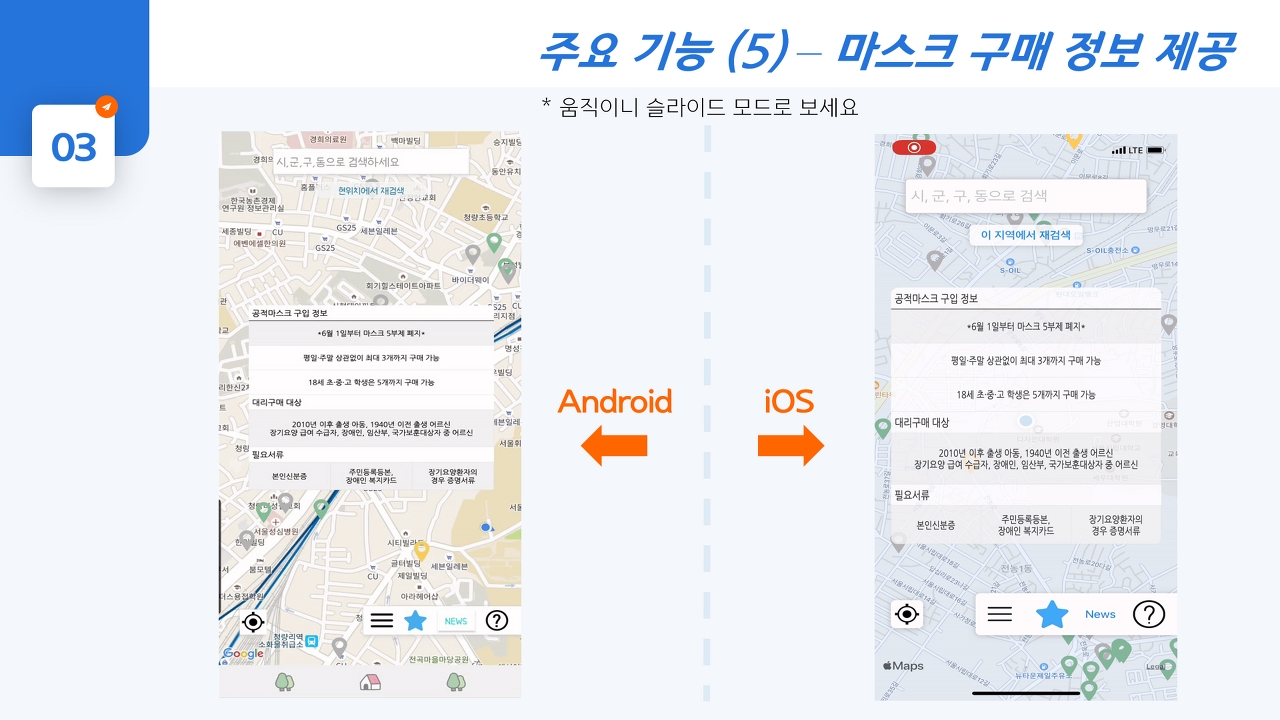 아래는 구현했던 기능들과 코드의 일부이다. 코드는 IOS는 담당하지 않았기에 안드로이드 버전만 첨부했다. 지도는 애플 내장 지도와 가장 흡사한 구글 지도를 사용했고, 마커는 마스크 재고에 따라 다른 색으로 표기했다. (녹색 100개 이상, 노란색은 30~99개, 빨간색은 2~99개, 회색은 0개)